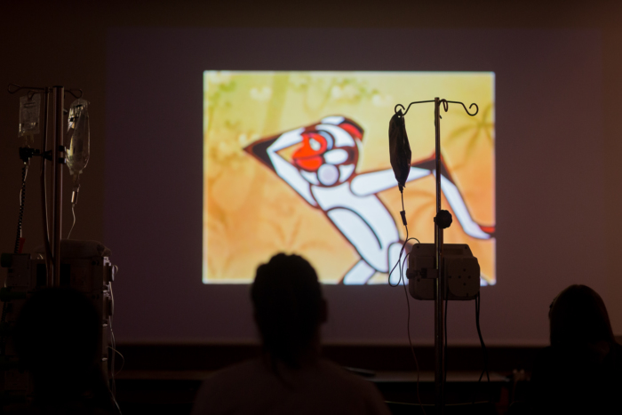 « Au fur et à mesure j’ai essayé d’étendre l’action. On est resté une année avec ce format DVD et puis on s’est demandé ce qu’on pourrait faire de plus… Il a fallu se poser, chercher des subventions. Les sous c’est vraiment le nerf de la guerre. On a répondu à des appels à projets et on a réussi à être financé à hauteur de 5000€ en 2013, par l’association Laurette Fugain. C’est l’association de la fille de Michel Fugain, qui lutte contre la leucémie et qui finance également des projets comme le nôtre. Grâce à cet argent, j’ai pu étendre les projections à la pédiatrie.