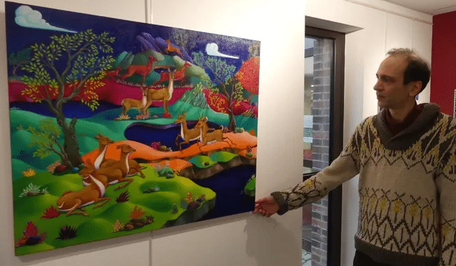 Le peintre David Kantorovitz, vit et travaille dans le Finistère. Ses toiles très colorées, très vives séduisent d’emblée les visiteurs. Sa peinture est marquée par une double volonté de variété et d’unité. L’abstraction et la figuration ne s’opposent pas ! L’art moderne est ici enrichi par des apports personnels du peintre. Le public est invité à cheminer du regard patiemment dans la toile, détail après détail !