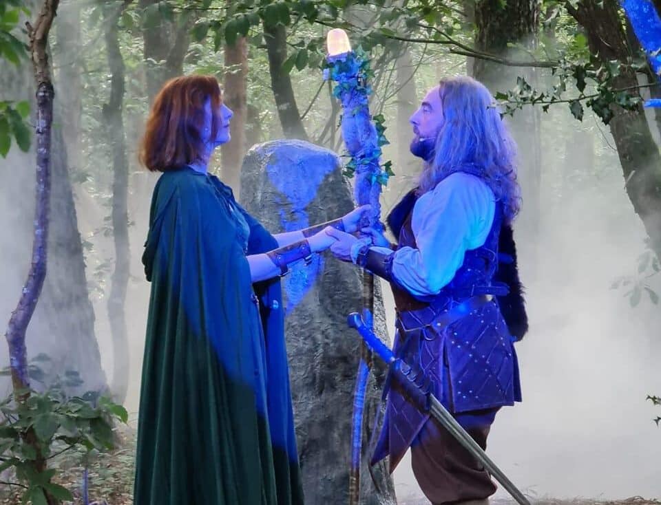 Au printemps 2023, la compagnie crée son premier spectacle autour des figures de Viviane et Merlin l’enchanteur. La cie Nemeton Fabula s’est imprégnée du littéraire, sans pour autant en faire un travail d’historien, mais plutôt un résultat autour du rêve, du merveilleux et de l’imaginaire pour en faire un spectacle familial et divertissant, comme l’a souhaité Sandra Nédellec l’assistante de production. Une chorégraphe d’escrime artistique, un compositeur et un régisseur technique est venu compléter l’équipe. La création du spectacle a eu lieu en mai et juin derniers suivie des répétitions dans le bois communal de Néant-sur-Yvel. L’histoire :