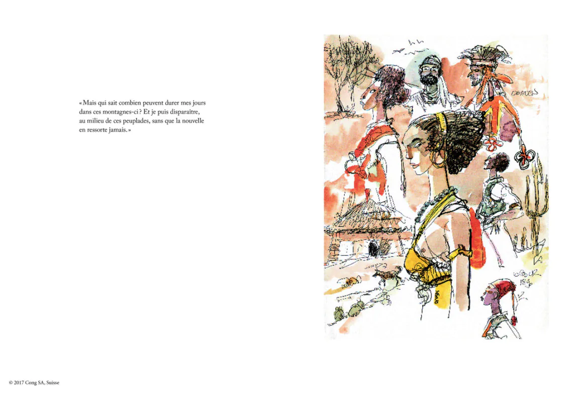 L’aspiration à l’aventure et l’attachement à l’Éthiopie relient Pratt et Rimbaud. Leurs dessins et les textes respectifs traduisent une très intime convergence doublée d’une infinie divergence. Si les 12 aquarelles d’Hugo Pratt dessinent un onirisme pétri de fierté ethnique et de volupté des corps, les recueils des lettres de Rimbaud montre l’homme aux semelles de vent devenu un négociant sans génie passer son temps à se démener dans un couloir d’adversité avec l’espoir d’atteindre au bout le soleil de la réussite. Pratt présente un recueil ethnologique fantasmé teinté d’amour nostalgique pour un lieu unique ; Rimbaud mine son corps et sa vie intérieure de promesses avortés dans une terre où son point d’ancrage se dérobe sans cesse.