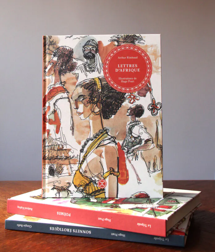 Entre 1991 et 1994, Hugo Pratt, le créateur de la bande dessinée initiatique, illustra d’aquarelles des textes rares d’Arthur Rimbaud, Rudyard Kipling et Giorgio Baffo. Ces recueils quasi introuvables ont été rassemblés dans le coffret Hugo PrattVoyages avec Rimbaud, Kipling, Baffo édité par les éditions du Tripode. Accompagnés de préfaces par Dominique Petitfaux, l’ensemble présente une mise en page complètement renouvelée. Le rapport texte/image, l’équilibre des volumes, la qualité d’impression et de fabrication sont au service d’un objet-livre d’une belle cohérence qui ravira aussi bien les aficionados d’Hugo Pratt que tout lecteur épris d’aventures et de liberté. Le premier tome (et voyage) de ce coffret Hugo Pratt est consacré à la dernière partie de la vie d’Arthur Rimbaud alors qu’il cherche – sans succès – à faire fortune entre le Yémen, la Somalie et l’Éthiopie.